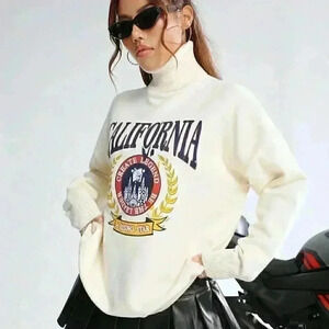 Beige Casual Womens Letter Graphic Turtleneck Drop Shoulder Sweater