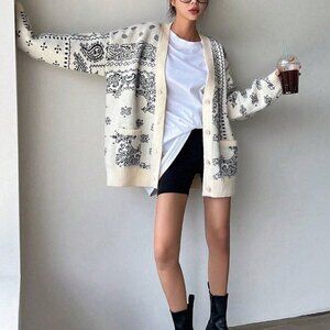 Beige Casual Women's Paisley Pattern Drop Shoulder button down Cardigan