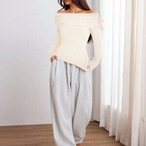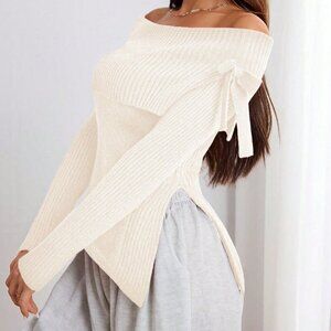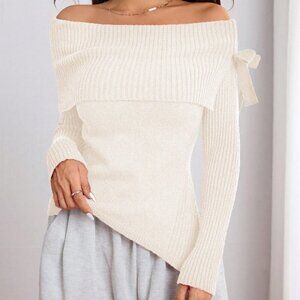 Beige Casual Women's Plain Off-Shoulder Long Sleeve Form-Fitting Sweater