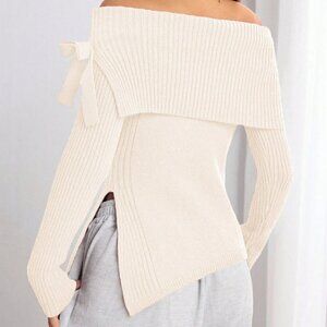 Beige Casual Women's Plain Off-Shoulder Long Sleeve Form-Fitting Sweater
