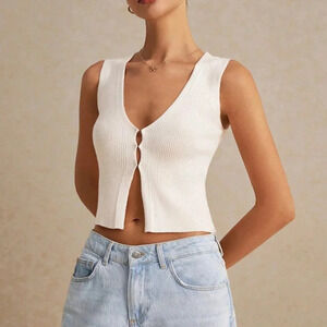 Beige Casual Women's Sleeveless Knit Open Placket Tank Top Vest