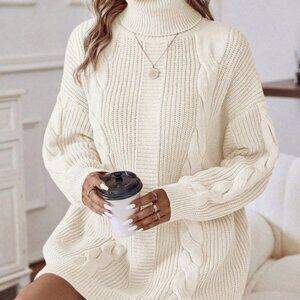 Beige Casual Womens Turtleneck Cable Knit Drop Shoulder Sweater Dress