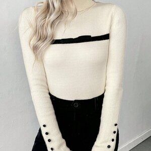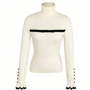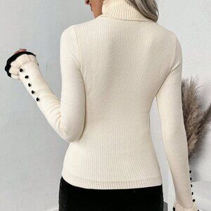Beige Casual Women's Turtleneck Ruffled Button Long Sleeve Knit Sweater With Bow