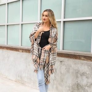 Beige Classic Plaid Pocket Ruana Shawl Wrap
