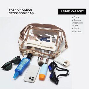 Features: Durable, water-repellent TPU material with a sleek, transparent design. Comes with a front zip pocket and a spacious mesh interior perfect for carrying your keys, phone, wallet, and tickets. The adjustable wide strap (15.7-26.8 inches) keeps it comfortable all day. Stylish touches include gold hardware and leather trim, making it versatile enough for any event or casual day out.