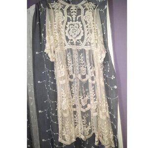 Women's Rachel Zoe beige/cream/off-white sheer lace long kimono/open front cardigan sweater/duster/cover up. ONE SIZE FITS MOST. Cropped 3/4 half sleeves/bell sleeves. Very good condition. No stains or holes.