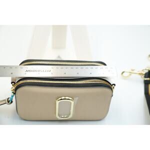 This compact beige crossbody camera bag features gold-tone hardware, black side panels, and a structured shape. Dual top zippers open to separate compartments, perfect for organizing daily essentials. Includes a detachable, wide striped strap in black, white, and gold for versatile wear. Appears unused with clean interior and exterior. Ideal for casual or travel use.