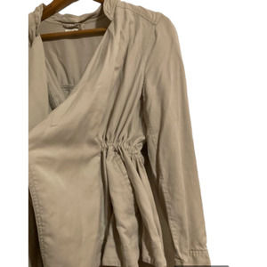 Drape collar. Long sleeves. Drawstring waist. Two front pockets. In gently used condition.
