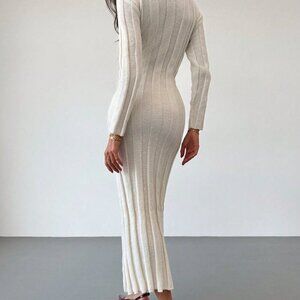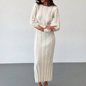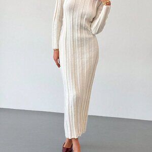 Beige Elegant Women's Crew Neck Long Warm & Comfortable Knit Casual Dress
