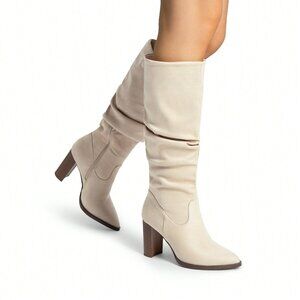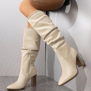 Beige Elegant Women's Knee-High Pointed Toe Chunky Block Heel Suede