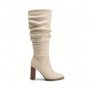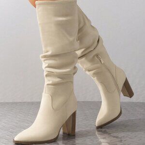 get ready for the season in these Beige Elegant Women's Knee-High Pointed Toe Chunky Block Heel Suede