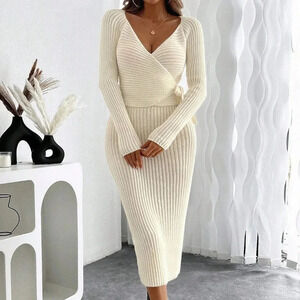 Beige Elegant Women's Stylish Knit V-Neck Cross-Tie Slimming Maxi Dress