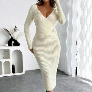 Beige Elegant Women's Stylish Knit V-Neck Cross-Tie Slimming Maxi Dress