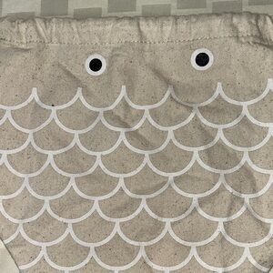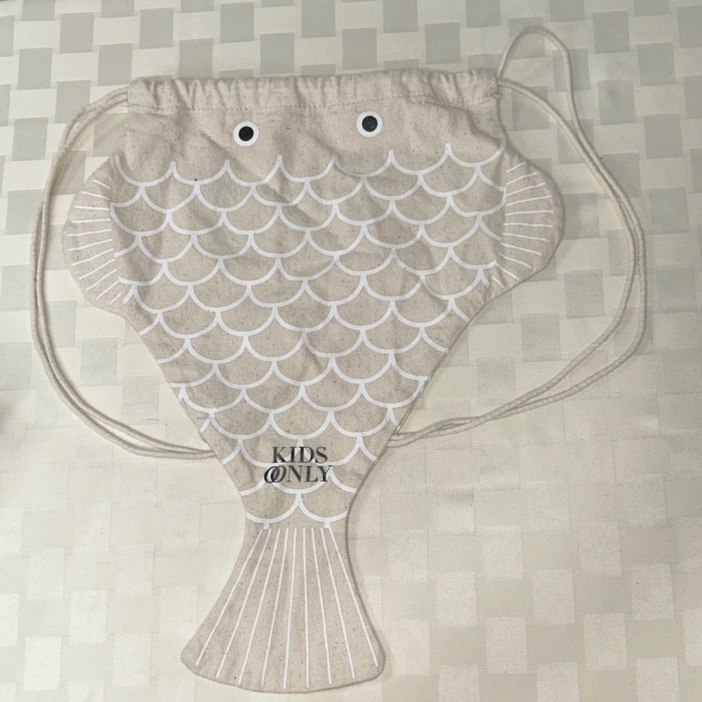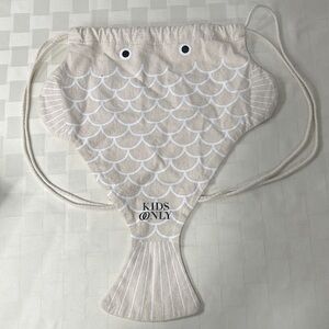 Charming fish-shaped drawstring bag by . Perfect for kids to carry their essentials. Features a delightful beige color with white accents.