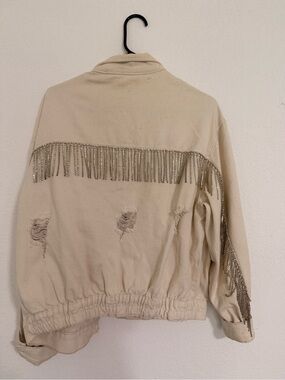 Stylish beige jacket with rhinestone fringe accents across the back and sleeves. Cool detailing adds an edgy, modern touch. Elastic hem and cuffed sleeves provide a comfortable fit. Versatile layering piece for casual and dressy looks.