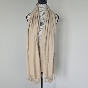 Elegant beige scarf with fringe detailing. Perfect for any outfit.