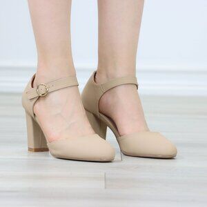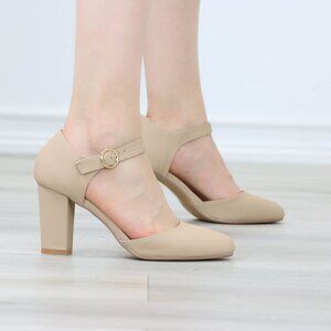 Beige High Heels Ankle Strap Almond Toe Block Classic Pumps Nubuck
