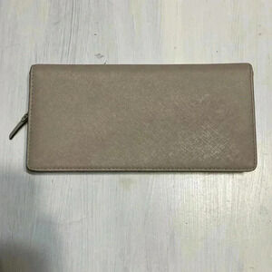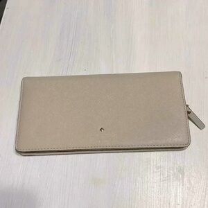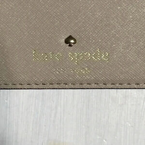Cow leather double snap close wallet - it’s a lighter beige than pictured - snaps work fine just have to line up - zipper coin pocket - 10 card slots and 2 bill slots. Beige with brown edging. corner has slight wear pictured. A bit dirty and coin zipper pocket has staining pictured - still pretty. Preowned good used condition please check all pictures. The Kate Spade on front a bit faded. 8” x 4” x 3/4”