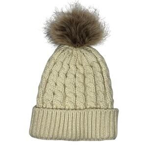 Beige Knit Brown Pom Pom Folded Beanie Unisex Adult One Size