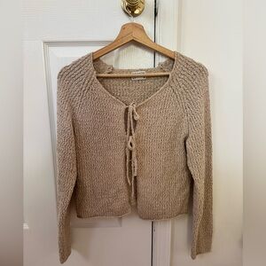 Delicate beige crochet cardigan with tie front is made from an organic cotton slub yarn for a handcrafted look.