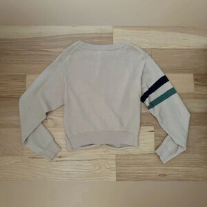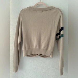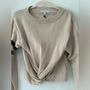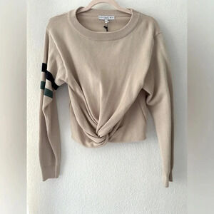 Stylish beige sweater featuring a unique knotted front design. Accented with black and green stripes on the sleeve for a modern touch. Perfect for casual outings.