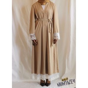 Beige Laced Kimono Open Abaya Kaftan Cover Up