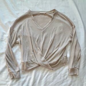 Stylish beige ribbed wrap sweater. Perfect for casual wear.