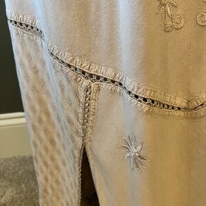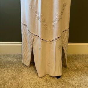 This maxi is a Boho style period. Any color compliments it. The waste is 16” with some give and can be made tighter. Unique fabric combo and needle point embellishments. In the last photo right in the middle I noticed a slight spot, very hard to see and even harder while wearing. There is no tag for brand or size but it is definitely a Large or X large.