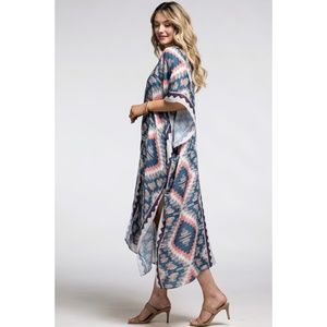 Beige Multi Long Open Front Aztec Tribal Pattern Kimono Wrap Coverup Top