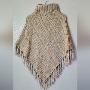 Stylish beige knit poncho featuring fringe detailing. Perfect for layering.