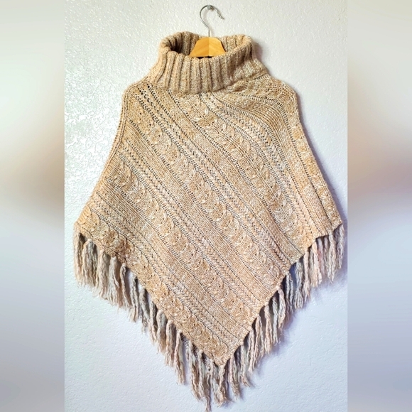 Stylish beige knit poncho featuring fringe detailing. Perfect for layering.