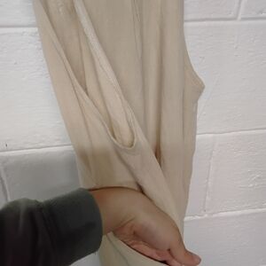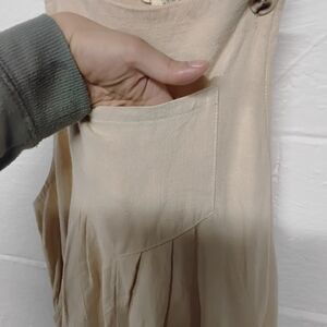Stylish wide leg beige overalls with button straps functional pockets. Perfect for casual wear.70% rayon 30% linen