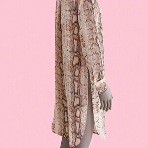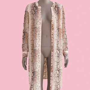 Beige pink snake print bikini cover up shirt dress in size medium. Neutral snake print semi sheer fabric. Button down shirt dress with tab collar. Long sleeve with button cuffs. To the knee length dress. This sexy and simple can be worn over a bikini or with a belted waist.