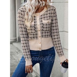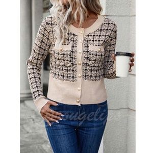 Beige Plaid Button Up Cardigan Knit Long Sleeve Chest Pocket