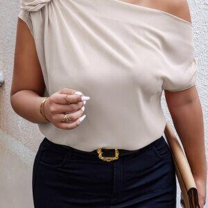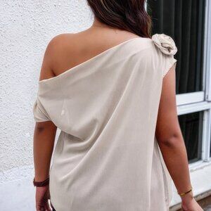 Beige Plus One Shoulder Top | Asymmetric Blouse with Floral Accent