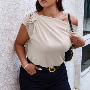 Elevate your wardrobe with this chic plus-size one-shoulder top, featuring an elegant asymmetric neckline and standout floral embellishment. Made from soft, lightweight 100% polyester, it offers a flattering drape and structured silhouette that moves beautifully. The bold flower accent adds a feminine touch, making this blouse perfect for everything from brunch dates to evening outings. Style it with jeans, tailored pants, or a skirt for a polished, confident look.