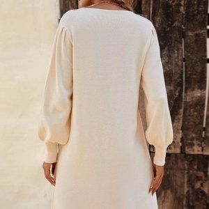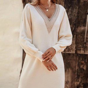 Beige Preppy Womens Guipure Lace Insert Lantern Sleeve Sweater Dress