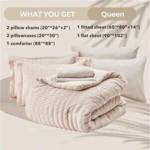Beige Queen Comforter Set Seersucker 7 Pieces, All Season Luxury Bed in a Bag