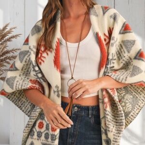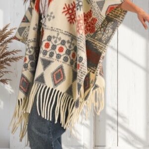 Beige and red ruana style open cape with winter western pattern. Fringed hemline.