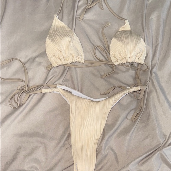 Stylish beige ribbed bikini set. Features a halter top and tie-side bottoms.