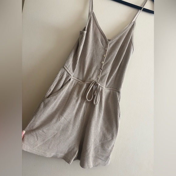Stylish beige ribbed romper with button-front and adjustable straps. Perfect for casual outings.