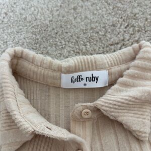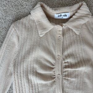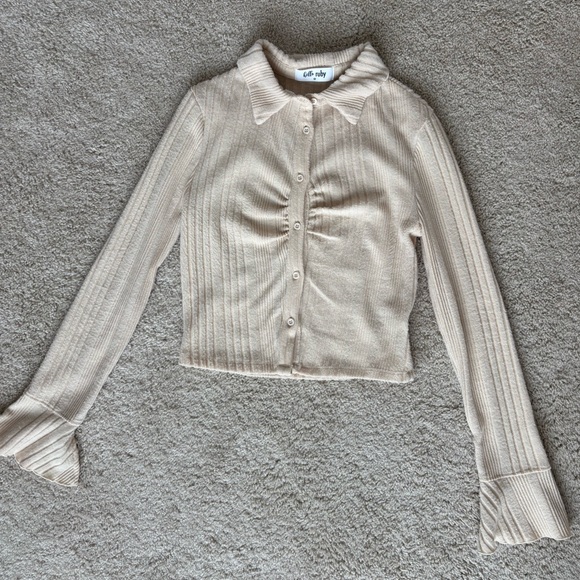 Stylish ribbed collared shirt with button-up front. Features a classic collar and long bell sleeves. Size medium.