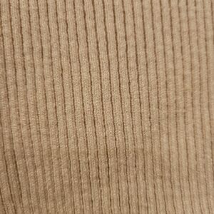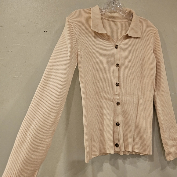 Stylish beige ribbed cardigan with button-up front. Perfect for layering.