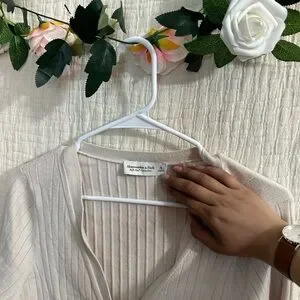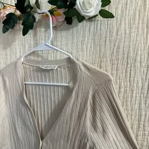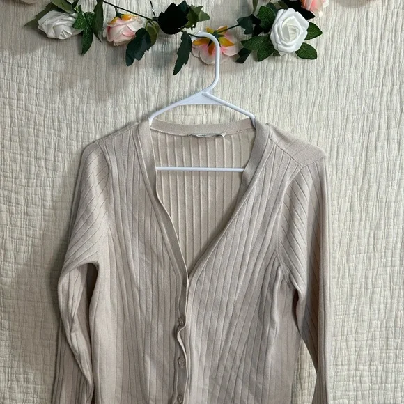 Elegant cream cardigan with ribbed texture. Ideal for layering.