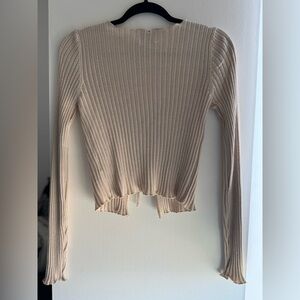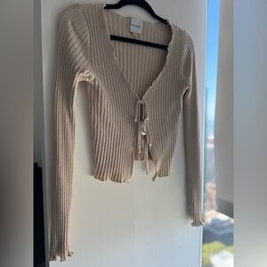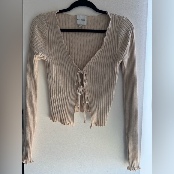 Chic ribbed knit blouse with tie front. Long sleeves and scalloped edges. Perfect for layering.