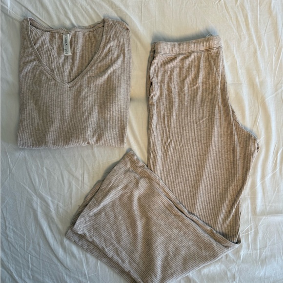 Cozy beige ribbed loungewear set. Includes a V-neck top and matching pants. Perfect for relaxing at home.