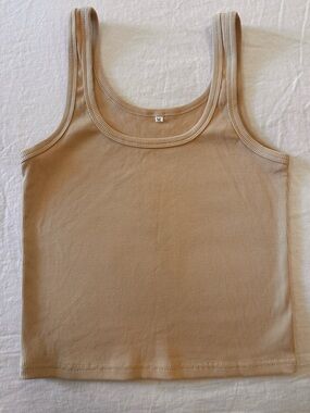 Soft beige ribbed tank top in a flattering scoop neck. Stretchy, comfortable fabric for everyday wear. Versatile beige color.