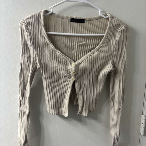 Chic beige ribbed cardigan with a V-neck and button closure. Ideal for layering.