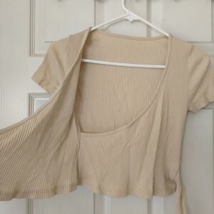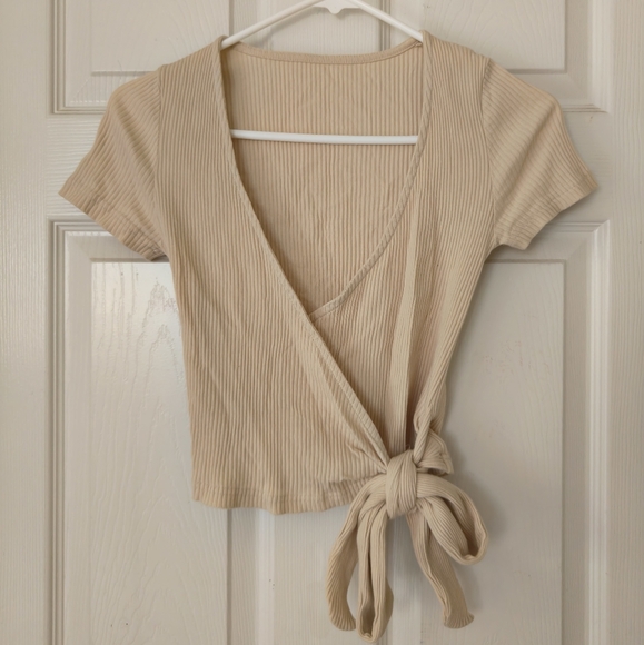 This crop top offers a flattering fit and a stylish tie wrap detail. The nuetral color makes it versatile for styling.