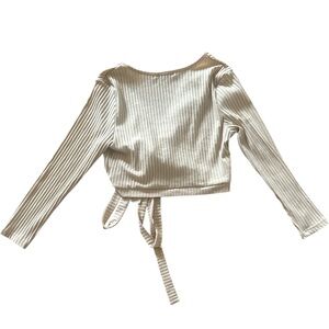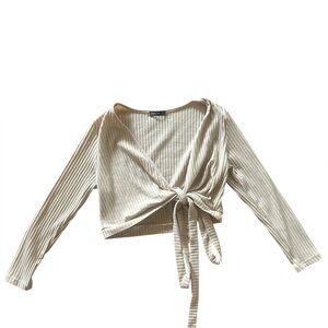 Elevate your style with this chic beige ribbed wrap top. Perfect for any occasion, it offers a flattering fit and a stylish tie detail.
